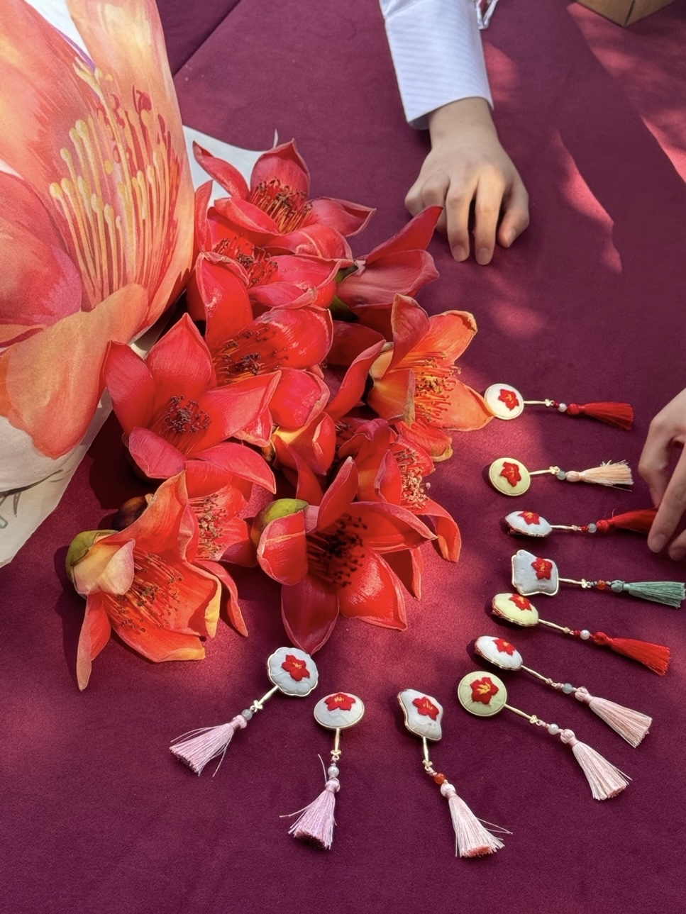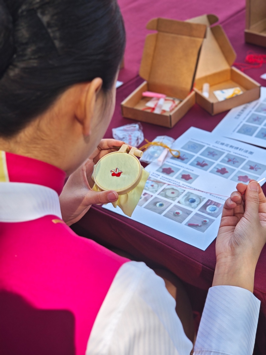 作为活动亮点,潮墟·花城学堂创新打造非遗体验场景。在非遗老师许冰指导下,学员们以绣布为媒,将南航标志木棉与岭南风韵相融,用针线绣出“丝光流转、色泽明艳”的红棉纹样。
